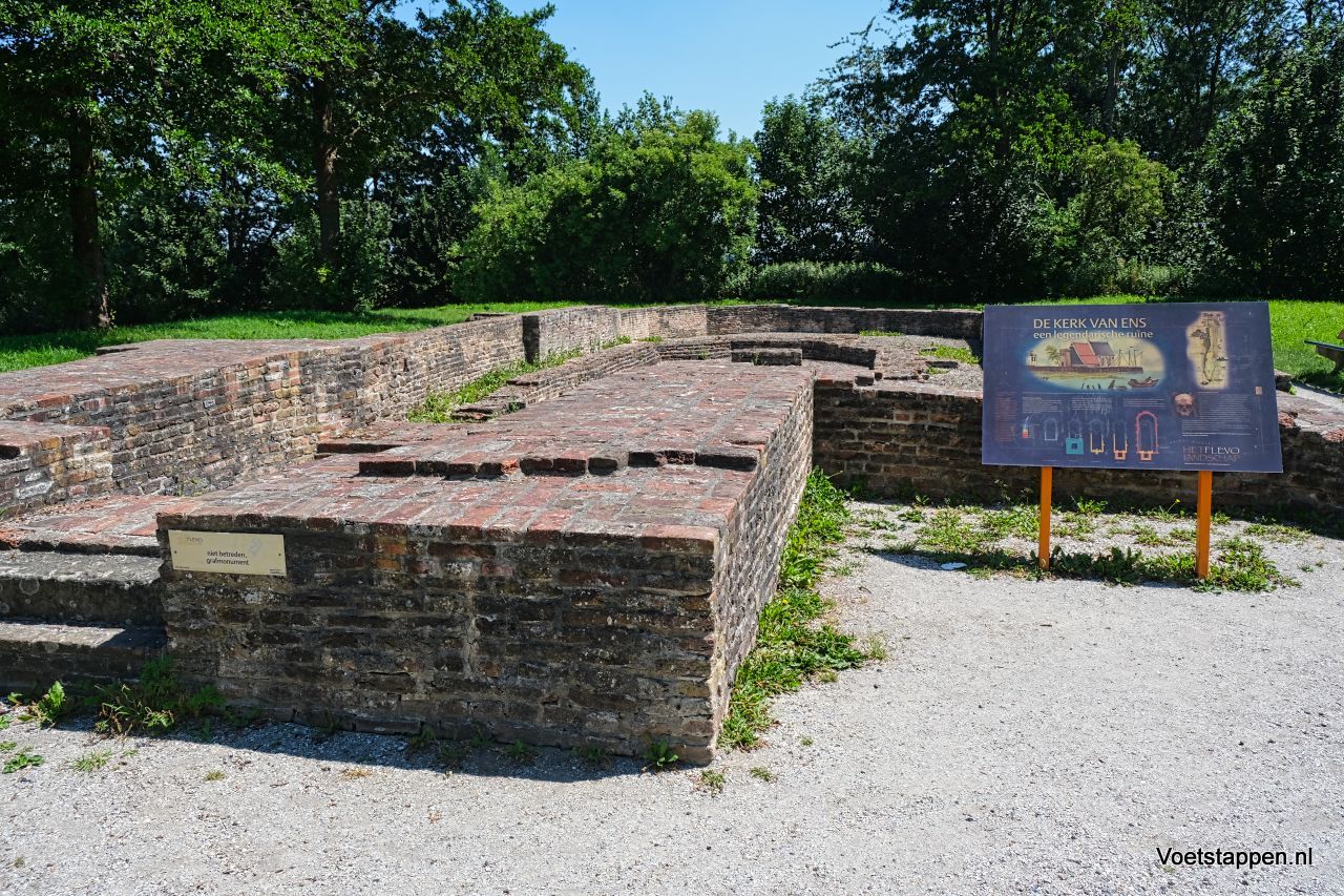 Zuiderbuurt. Hier staat een voorbeeld van een vroegere gezinswoning en even verderop komen we bij de ruïne van de oude kerk van Ens.