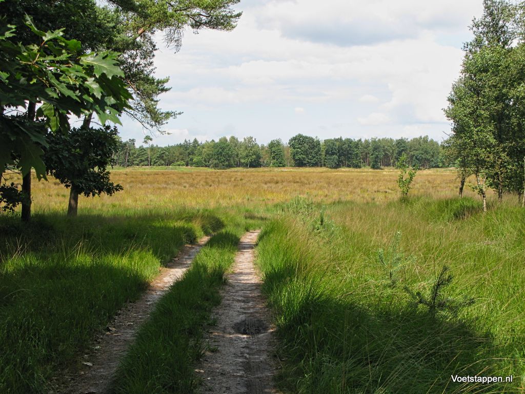 Na een gebied waar veel bosbessen groeien komen we, na een slagboom en picknicktafel, in een open weidegebied met een natuurcamping. Doch even later lopen we via een zandpad de bossen van het landgoed Valkenberg weer in.