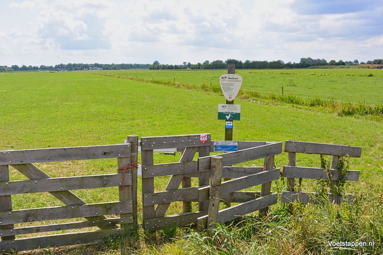 Het pad voert ons nu weer door het weiland en via opstapjes lopen we van het ene weiland naar het andere weiland.