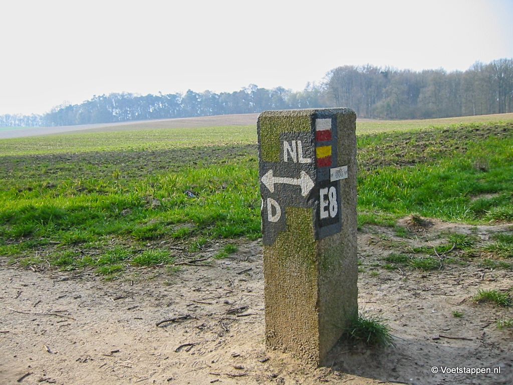 Onder een zonnige hemel beginnen wij het Lingepad in Wyler te belopen waar we al direct over heuvelachtig terrein de grens