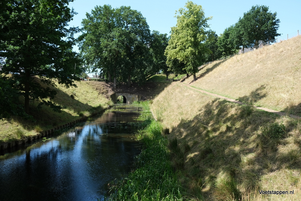 Via de Onnastraat lopen we door de oude vestingsmuur en wandelen direct daarna een onverhard pad op langs de vestingswal en gracht die we even gaan volgen.