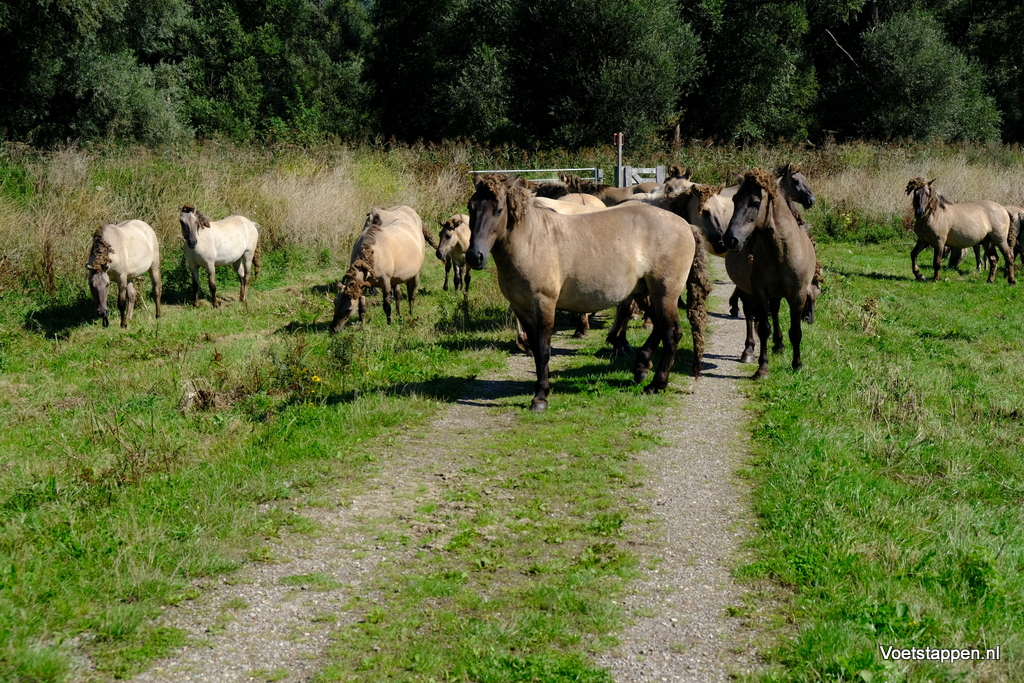 Na enkele bospaden bereiken we een gebied vol met waterpartijen. Hier lopen verschillende Konikspaarden rond die soms ook op het wandelpad staan of lopen.